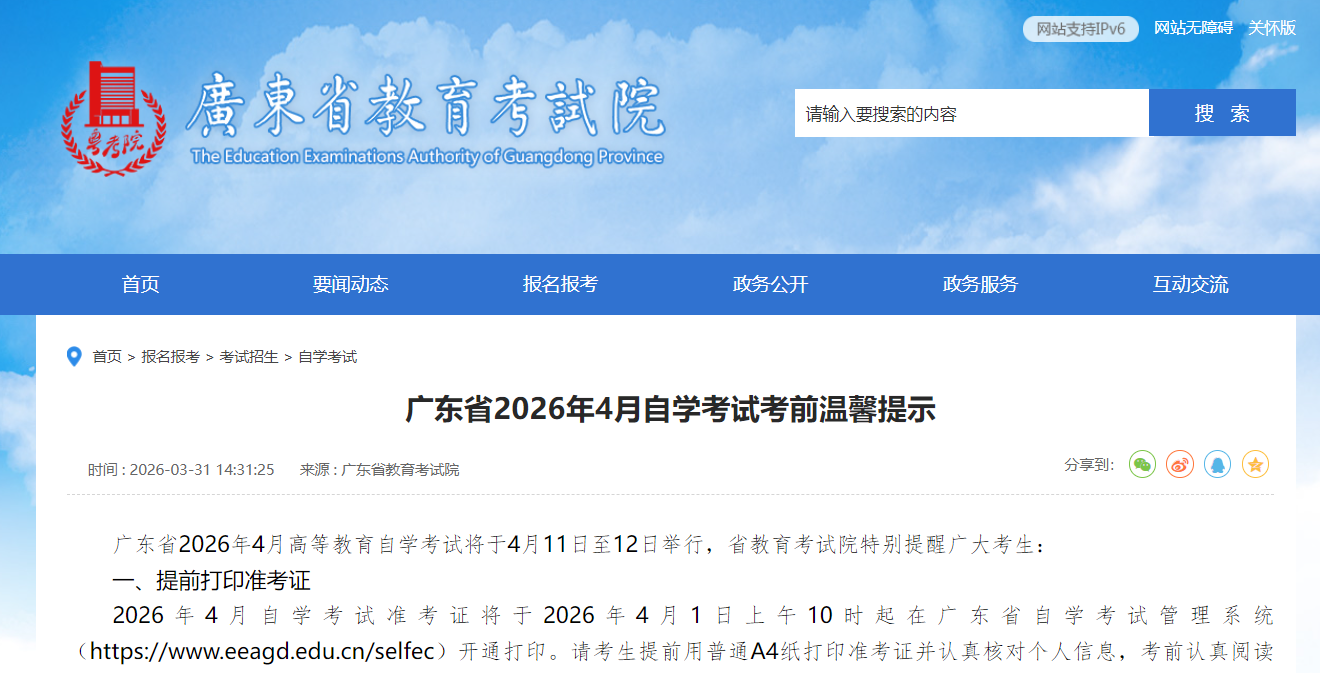 广东省2026年4月高等教育自学考试将于4月11日至12日举行,省教育考试院特别提醒广大考生: